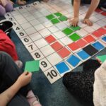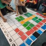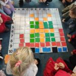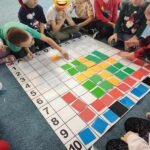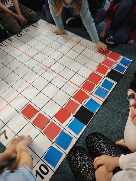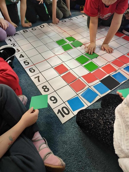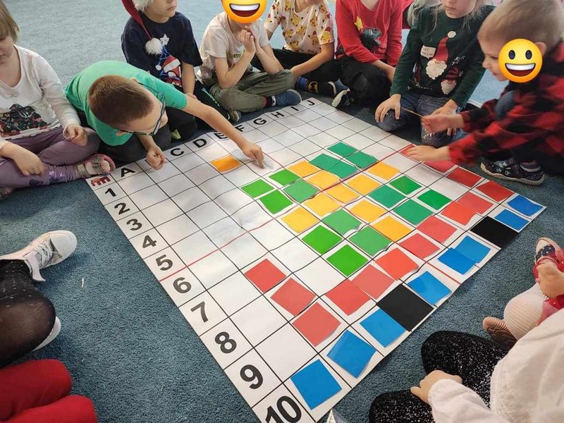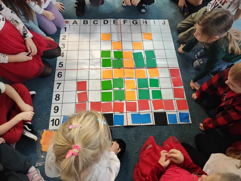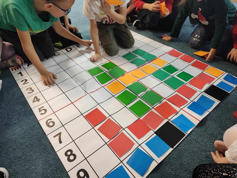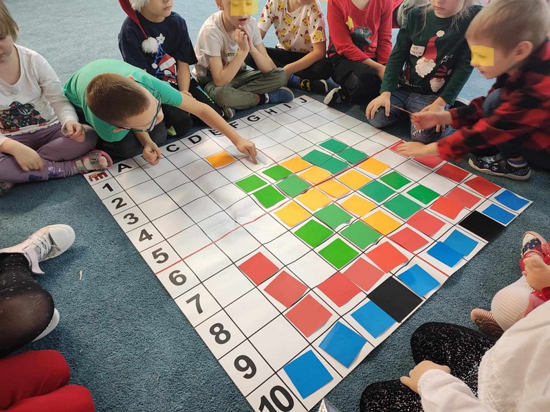 Kodowanie na dywanie- prezent”- dzieci z grupy IV rozwijały swoje kompetencje matematyczne, umiejętności społeczne. Wspólnie odnajdowały dane współrzędne na macie, kodując prezent. Brawo!!!