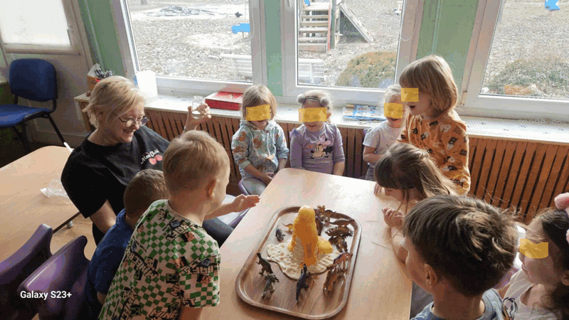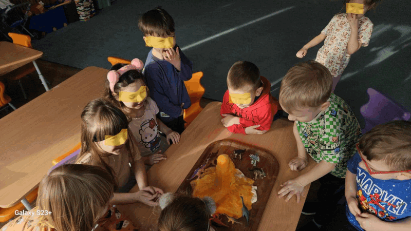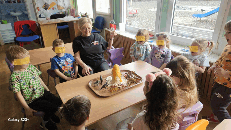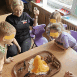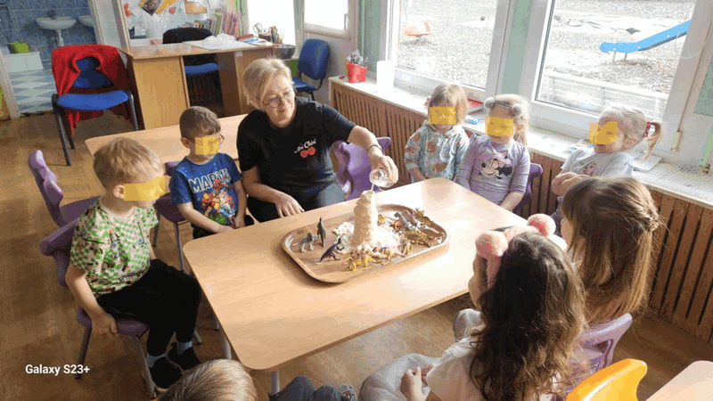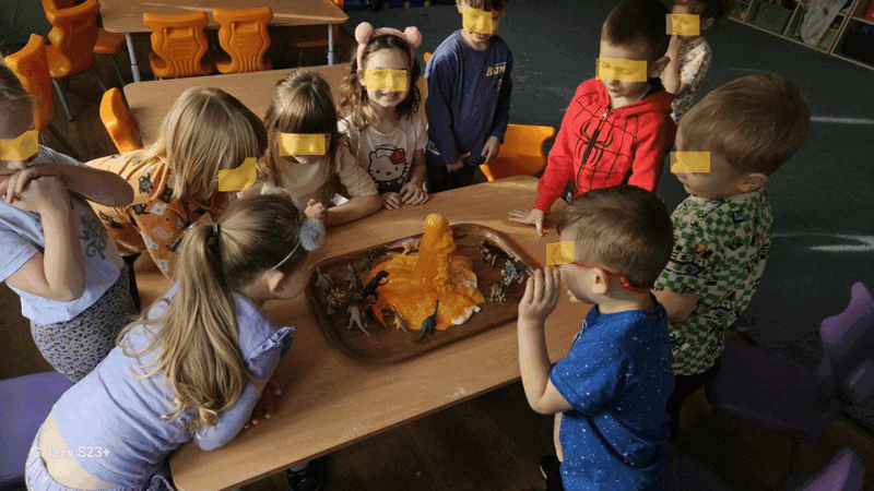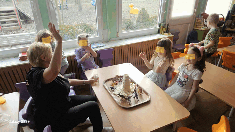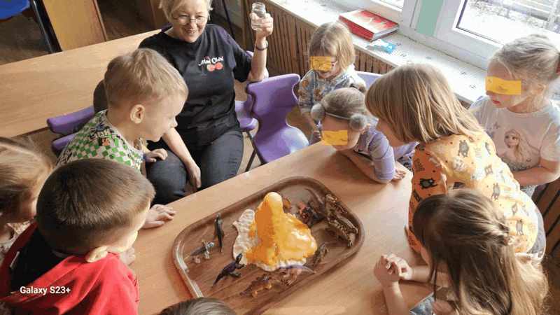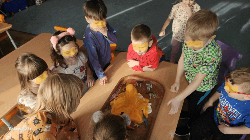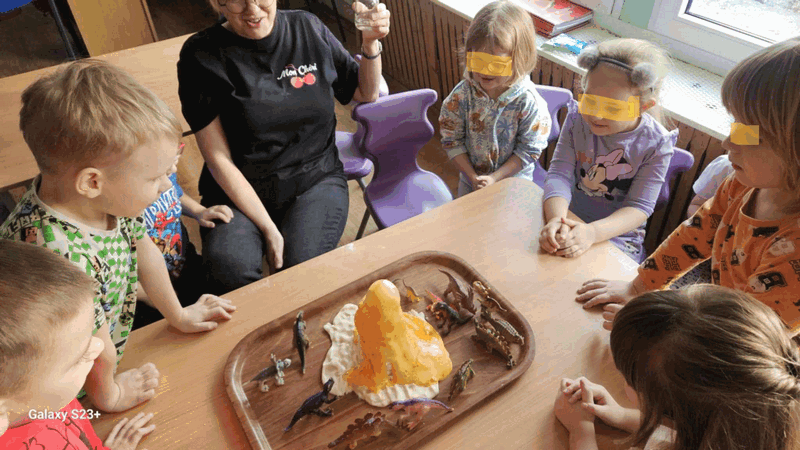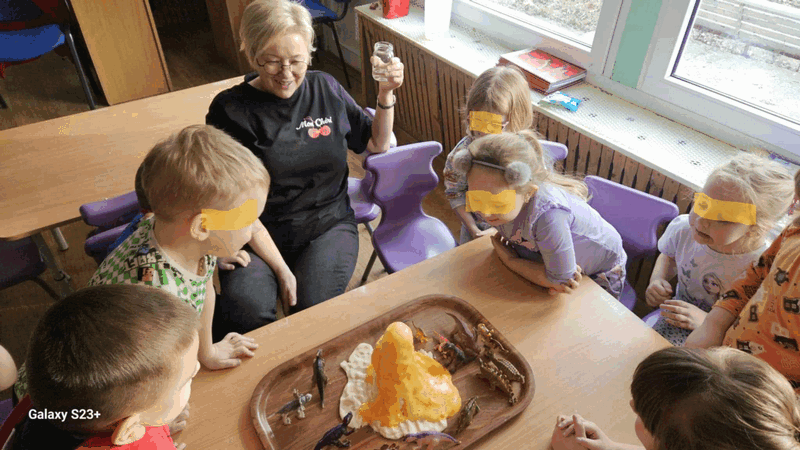 Wulkan”- dzieci z grupy II obserwowały eksperyment -wybuchający wulkan, pani Basia zadbała o efekty specjalne-kolorową lawę.