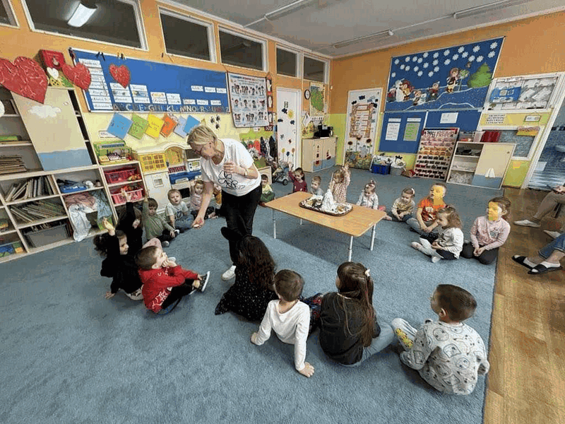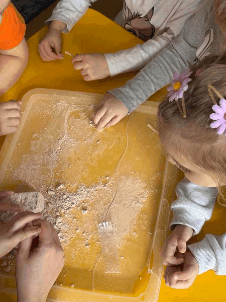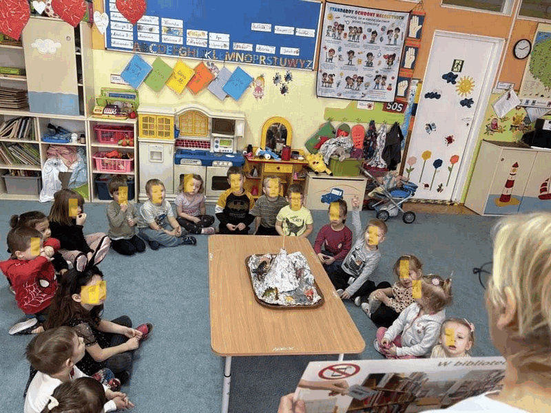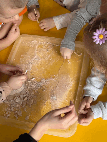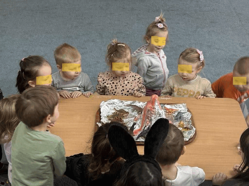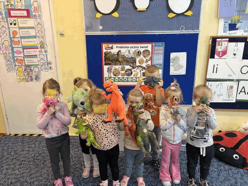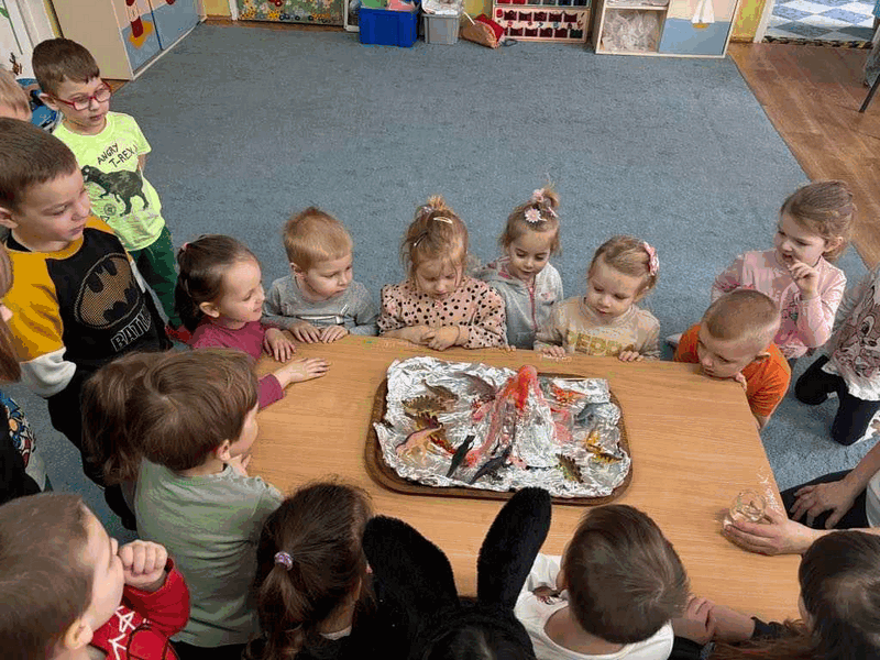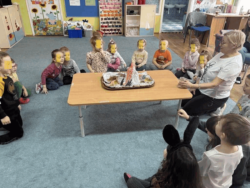Dzień dinozaura”- dzieci z grupy I i II aktywnie uczestniczyły w zabawach badawczych- poszerzały swoje wiadomości nt. dinozaurów jak żyły czym się odżywiały. Dzieci poszukiwały „kości dinozaurów” bawiąc się w archeologów, obserwowały wybuchający wulkan.