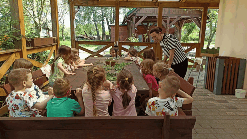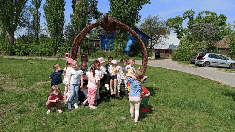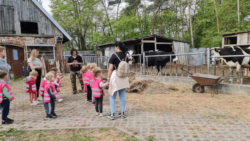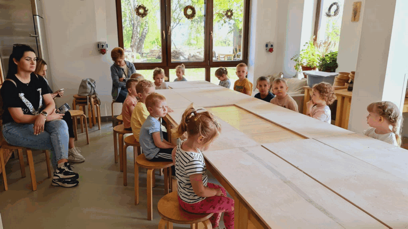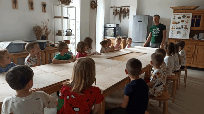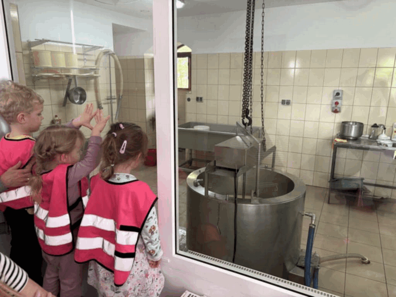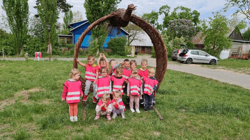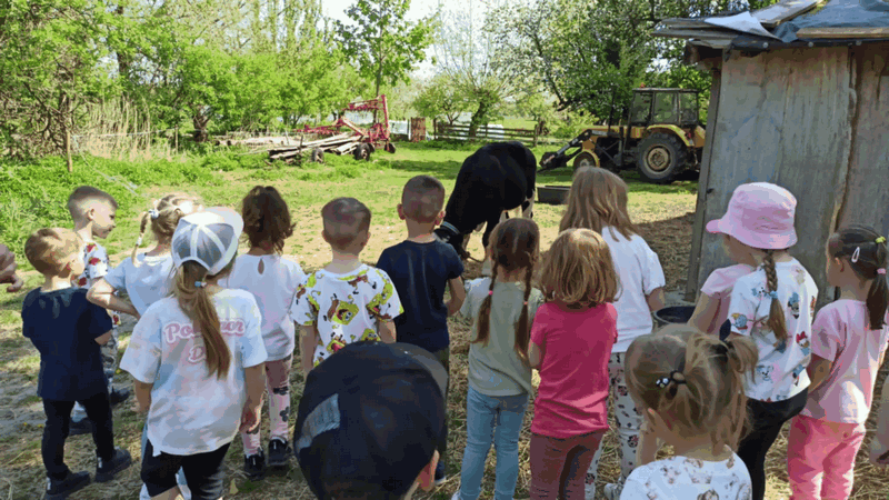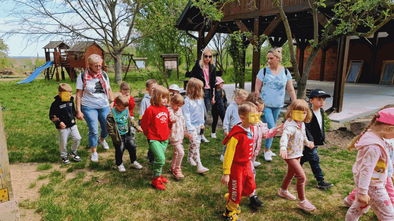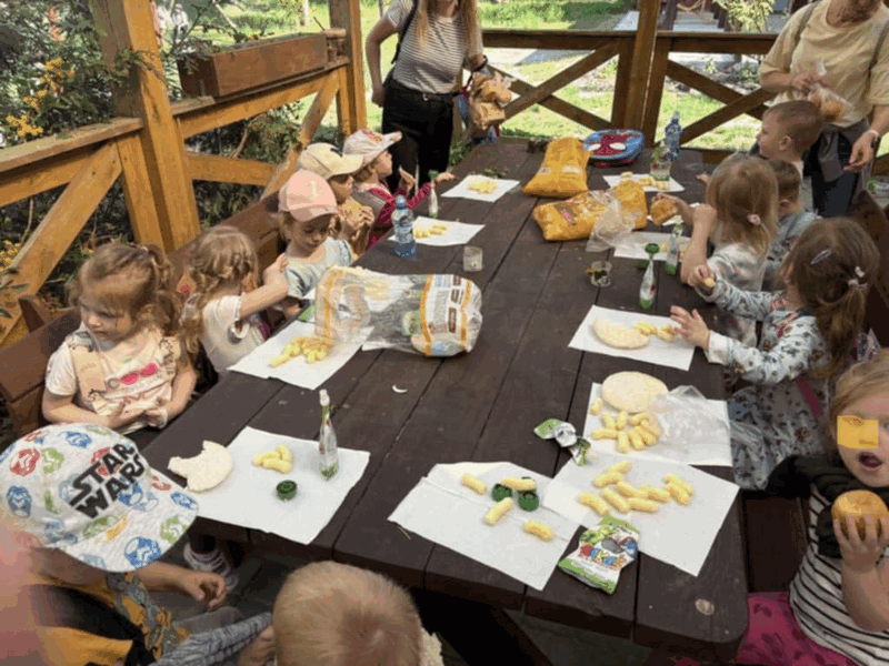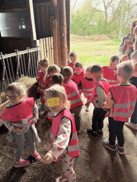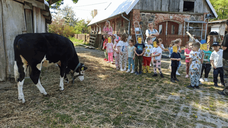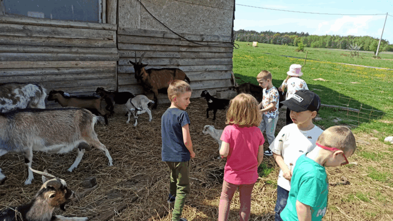 „Wycieczka do Gospodarstwa Ekologicznego w Grzybowie”-dzieci z grupy I i II. Odwiedziły ośrodek Stowarzyszenia ZIARNO znajdujące się przy gospodarstwie ekologicznym w Grzybowie. Dzieci zjadły ekologiczne śniadanie i obiad serwowany przez ośrodek. Poznały zasady funkcjonowania gospodarstwa ekologicznego,dowiedziały się skąd pochodzą produkty żywnościowe; mleko jak się robi sery, masło.