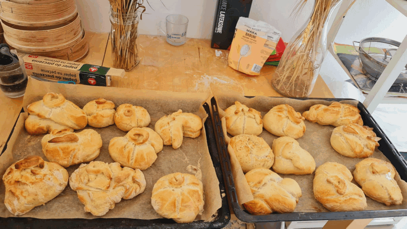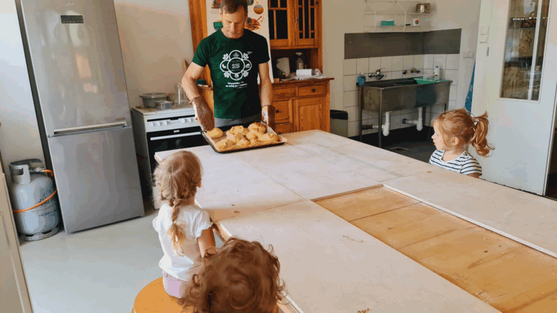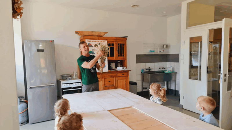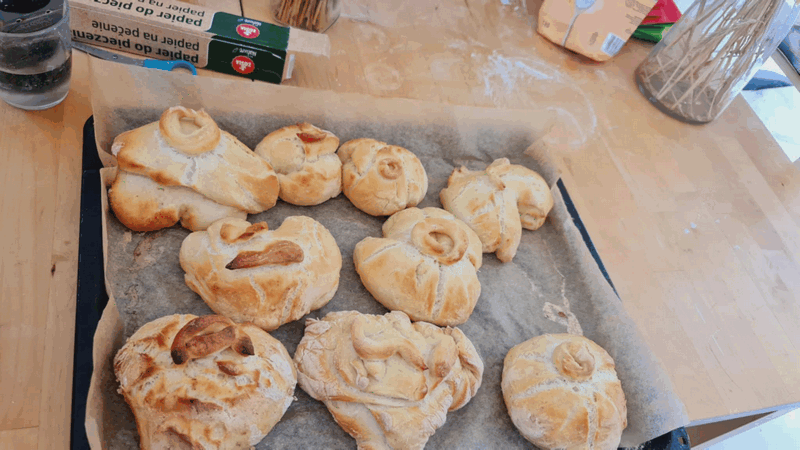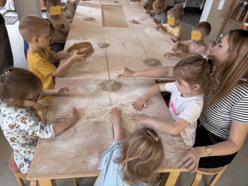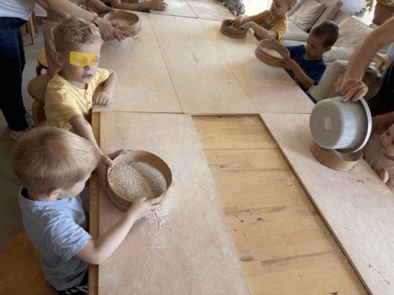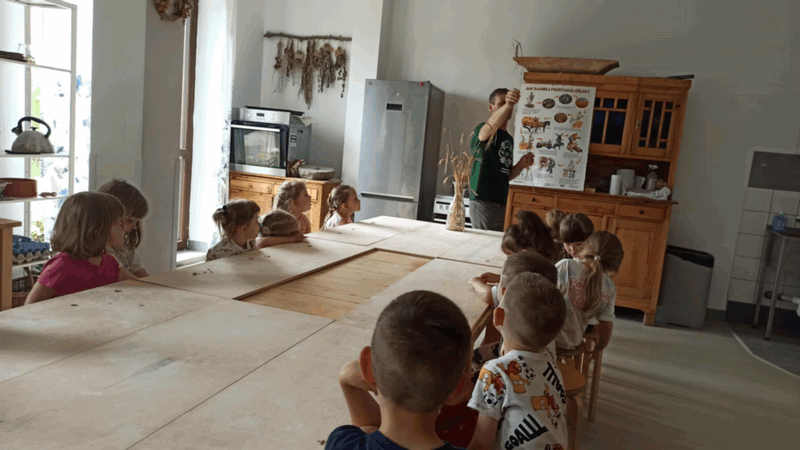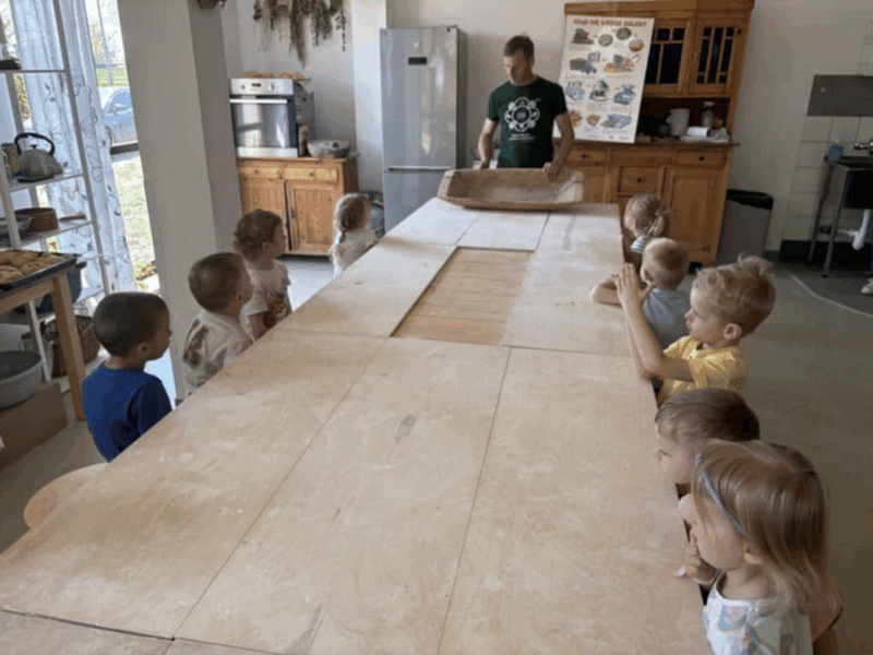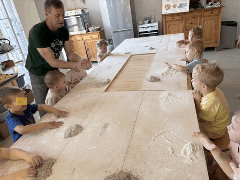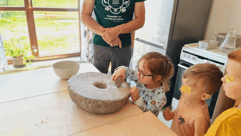 „Od ziarna do razowego bochna”- zajęcia w Biopiekarni , gdzie dowiedziały się wszystkiego o rodzajach mąki, zobaczyły jak miele się ziarno. Dzieci własnoręcznie wykonały bułki