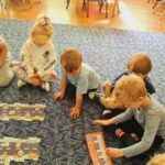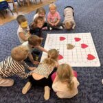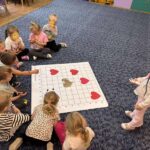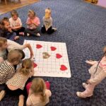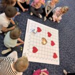 „Kodowanie na dywanie- serce”- dzieci z grupy I doskonaliły kompetencje matematyczne, umiejętności społeczne posługując się edupandą. Przedszkolaki układały obrazki kierując się podanymi w zadaniu warunkami;