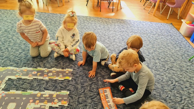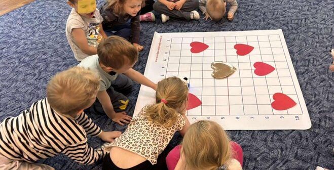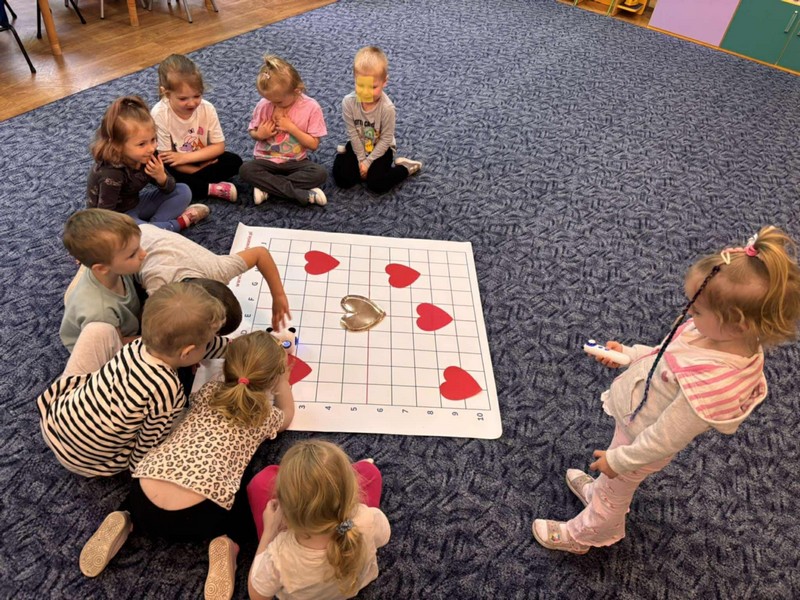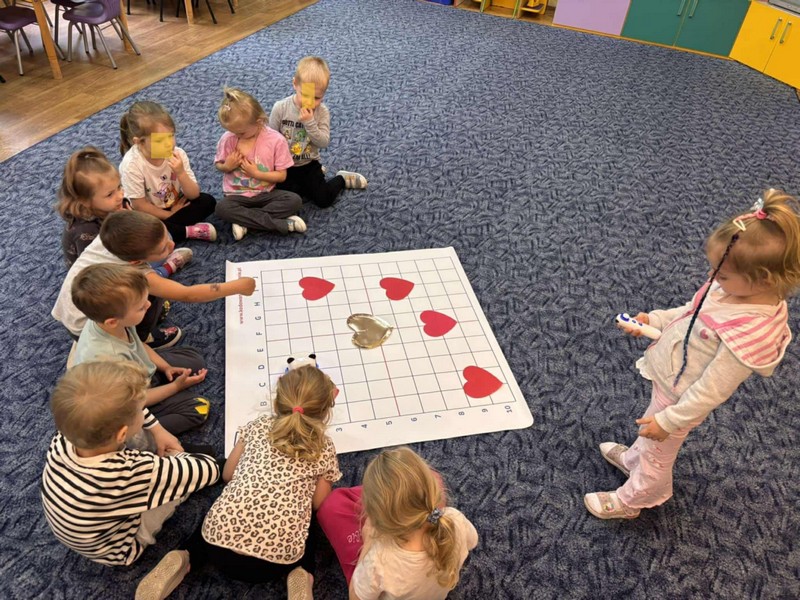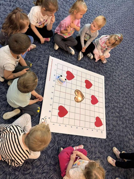 „Kodowanie na dywanie- serce”- dzieci z grupy I doskonaliły kompetencje matematyczne, umiejętności społeczne posługując się edupandą. Przedszkolaki układały obrazki kierując się podanymi w zadaniu warunkami;
