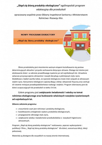 „Skąd się biorą produkty ekologiczne” – ogólnopolski program edukacyjny dla przedszkoli opracowany wspólnie z Ministerstwem Rolnictwa i Rozwoju Wsi.