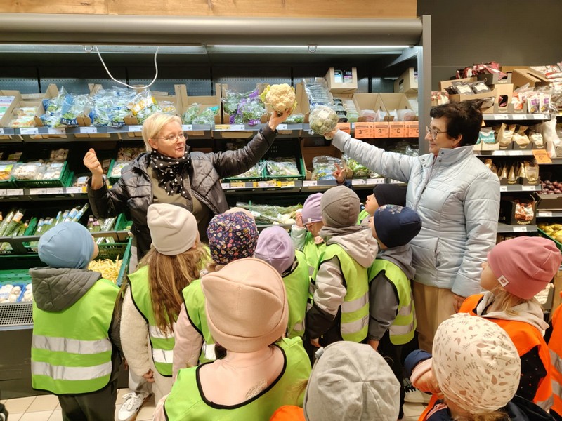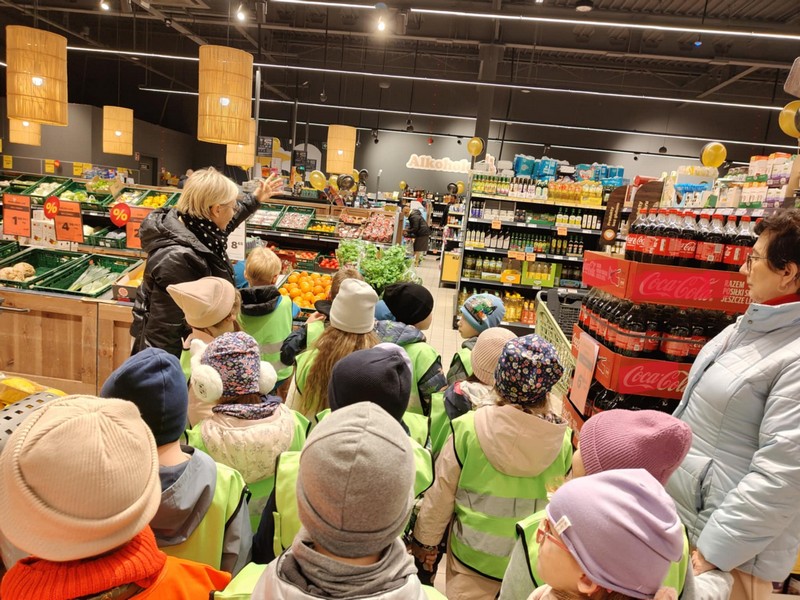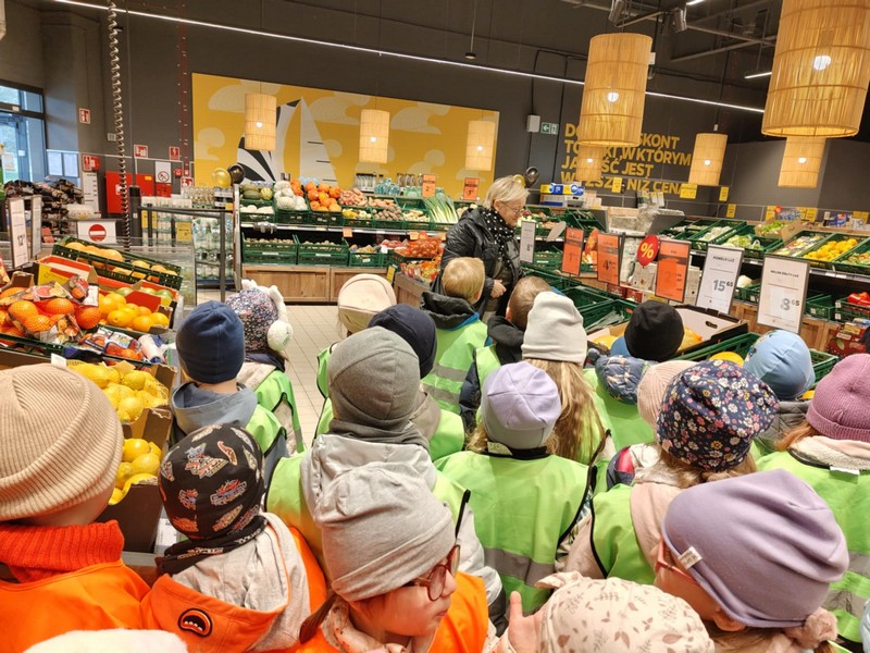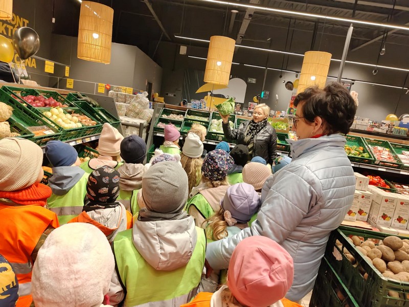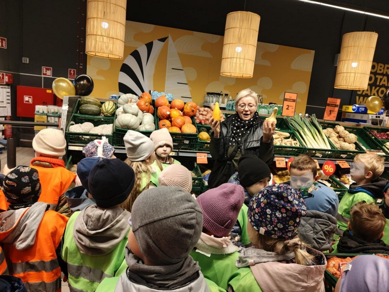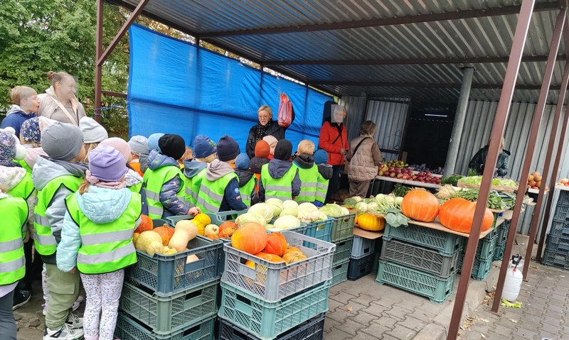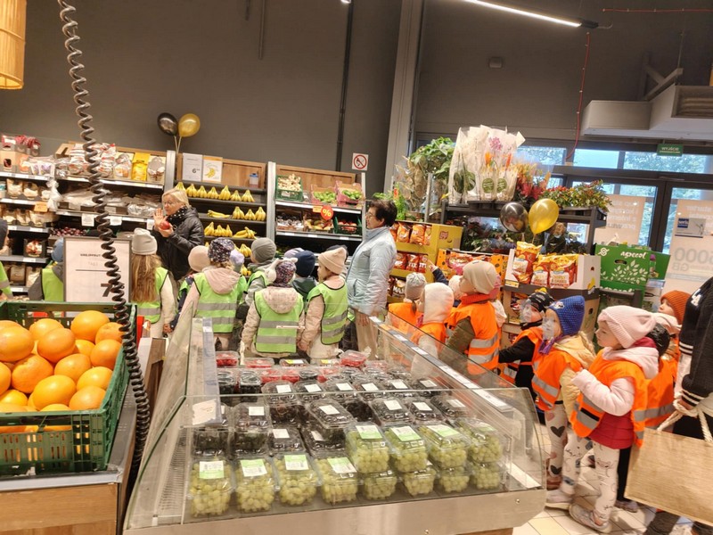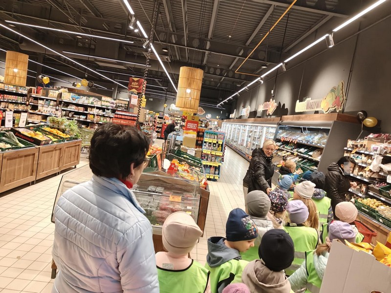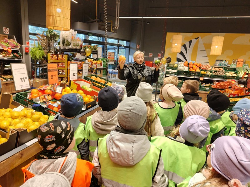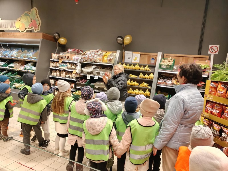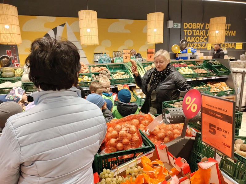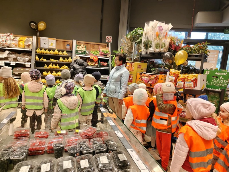 „Kolorowe i pachnące owoce i warzywa” – wycieczka do sklepu owocowo-warzywnego i straganu owocowo-warzywnego. Dzieci z grupy II i III, poznały owoce i warzywa ich właściwości. Pani Basia prezentowała dzieciom warzywa i owoce, omawiając ich właściwości zdrowotne. Przedszkolaki szukały na owocach, warzywach symbolu zielonego listka, wskazującego produkty ekologiczne.