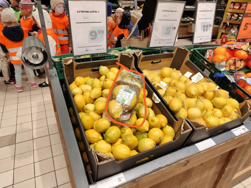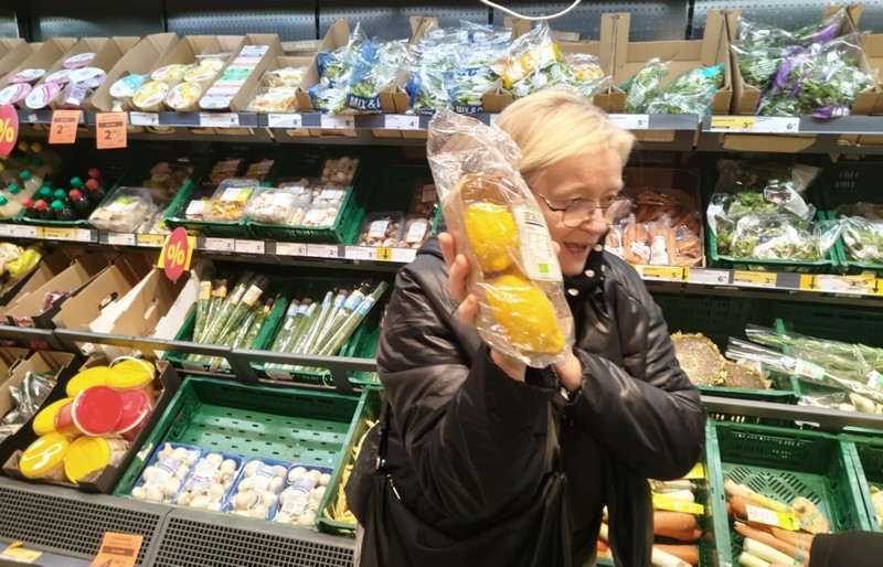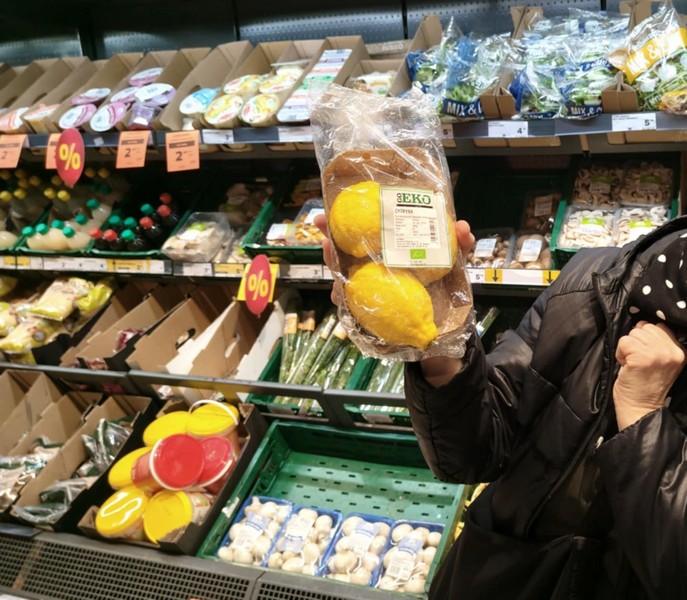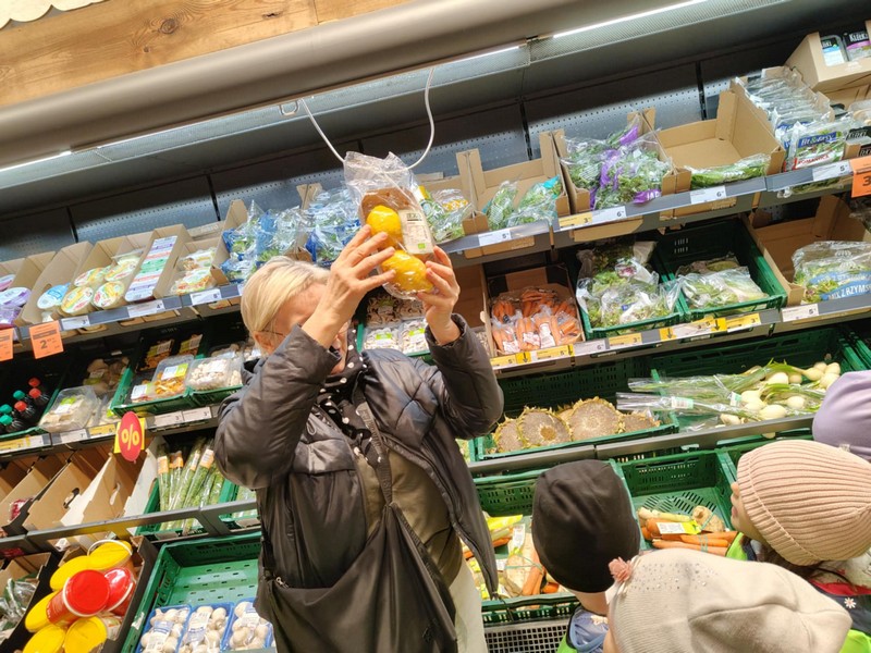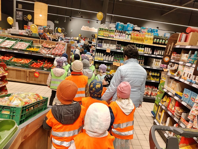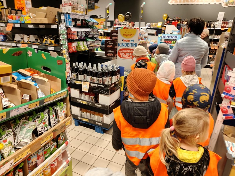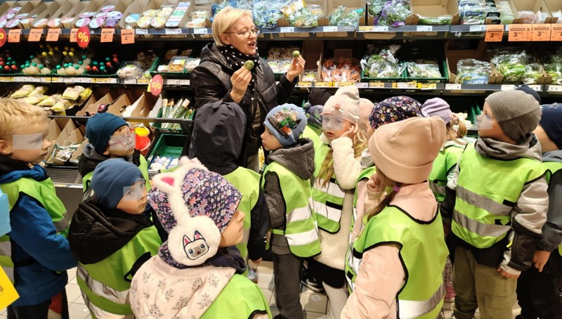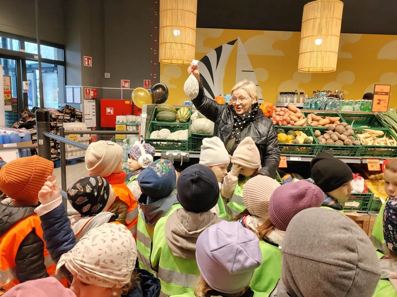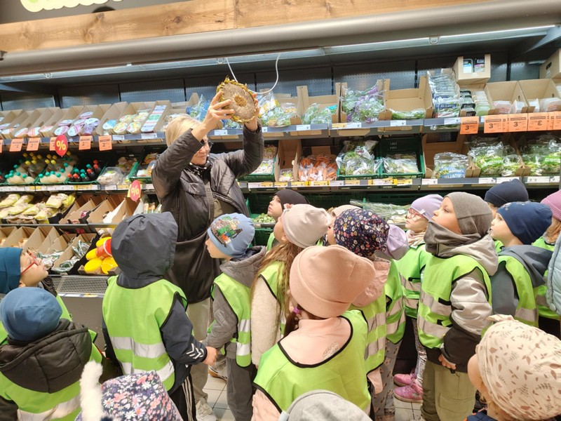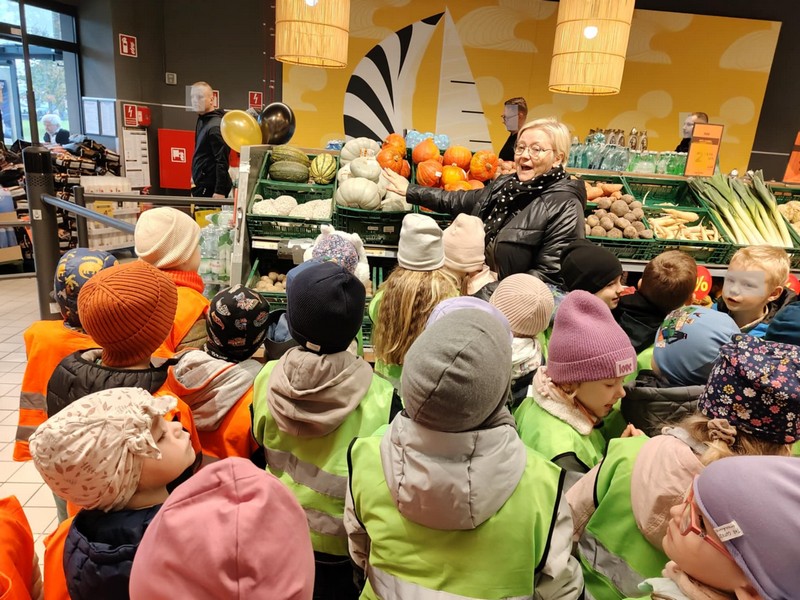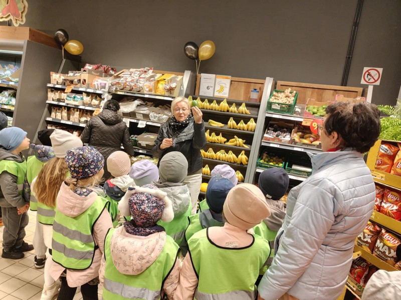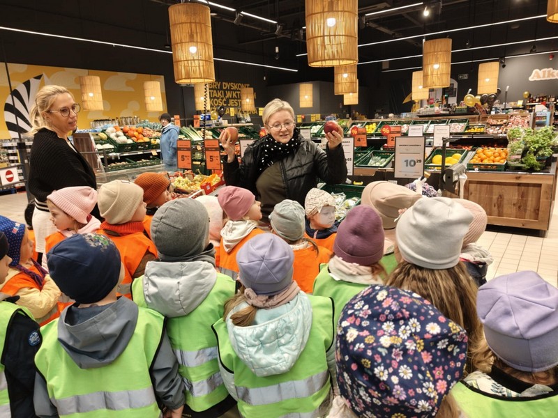 „Kolorowe i pachnące owoce i warzywa” – wycieczka do sklepu owocowo-warzywnego i straganu owocowo-warzywnego. Dzieci z grupy II i III, poznały owoce i warzywa ich właściwości. Pani Basia prezentowała dzieciom warzywa i owoce, omawiając ich właściwości zdrowotne. Przedszkolaki szukały na owocach, warzywach symbolu zielonego listka, wskazującego produkty ekologiczne.