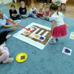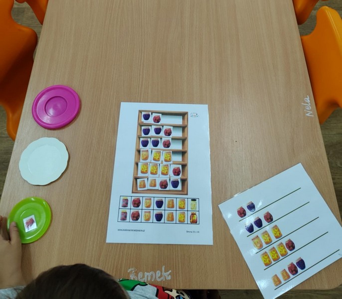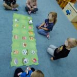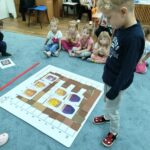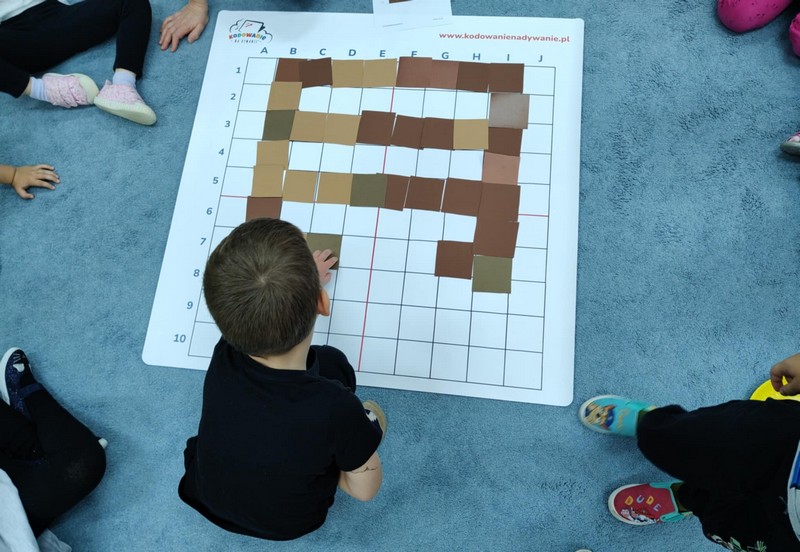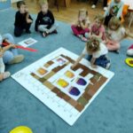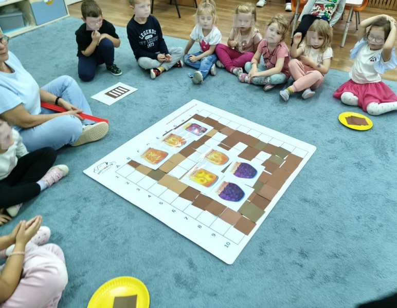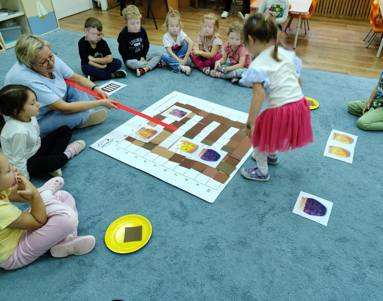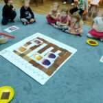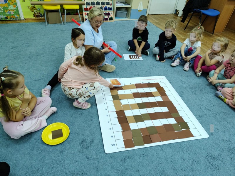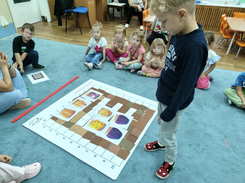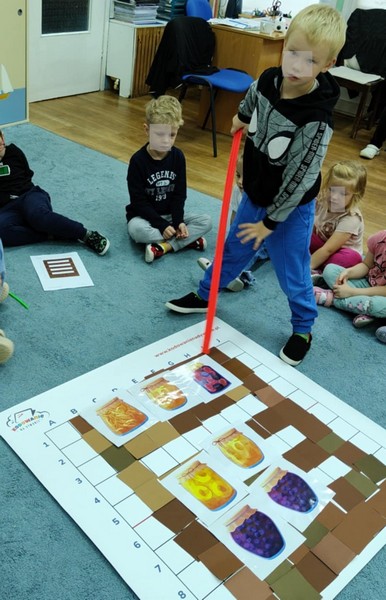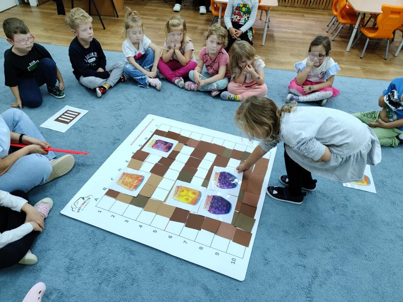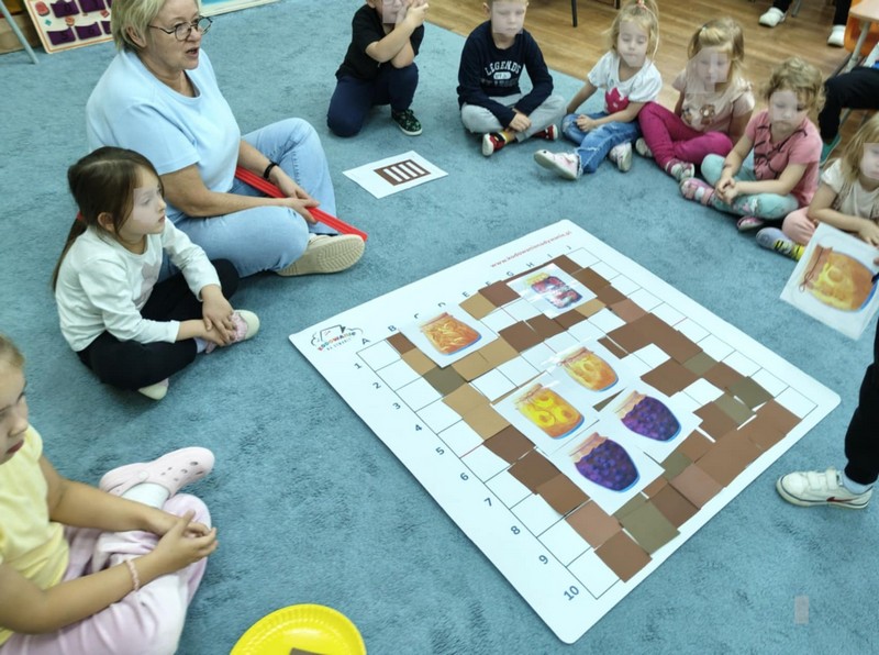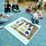 „Kodowanie na dywanie „Jesienne przetwory” -z ogromnym zaangażowaniem dzieci 4-5 letnie z grupy II i III, wykonywały zadanie. Rozwijały swoje kompetencje matematyczne, współpracowały na macie. Dzieci poszerzały wiadomości nt. wybranych witamin, owocowych i warzywnych przetworów. Układały obrazki zgodnie z podanymi warunkami, kształciły współpracę w grupie. Brawo!!!