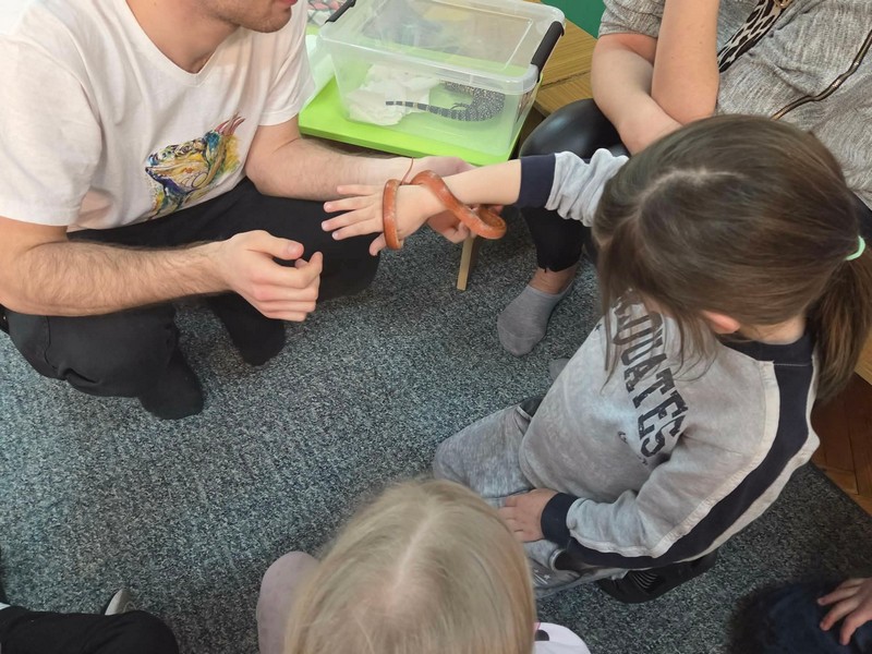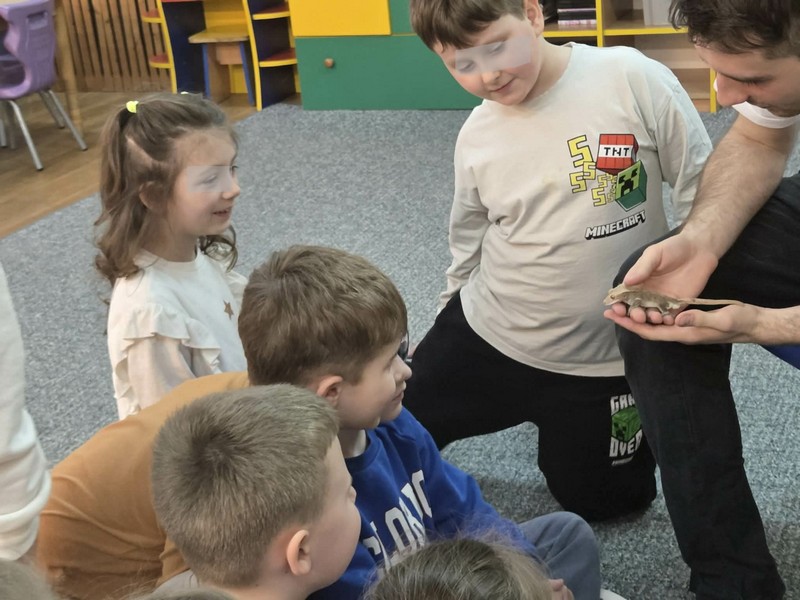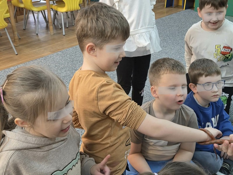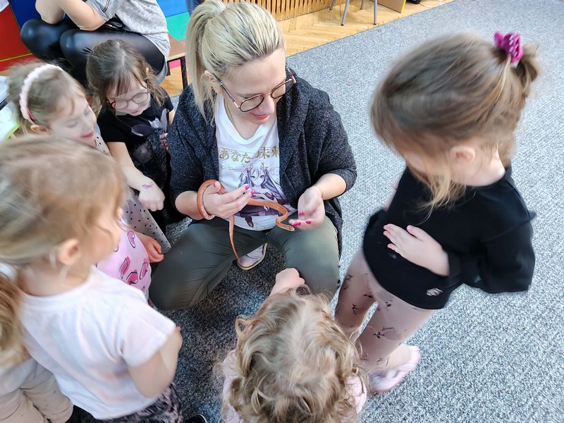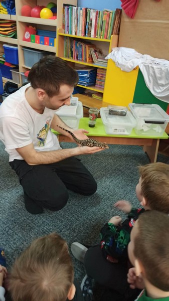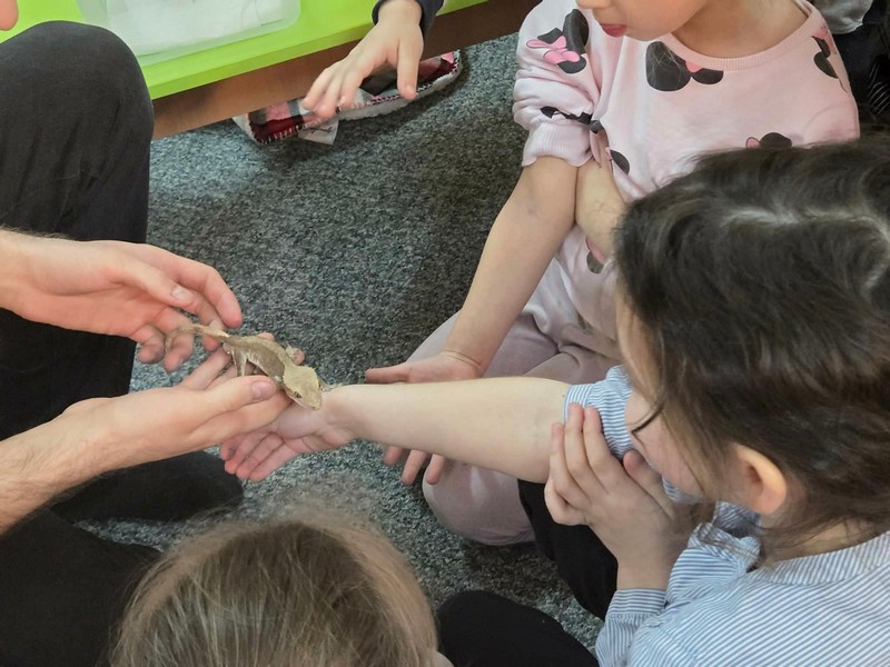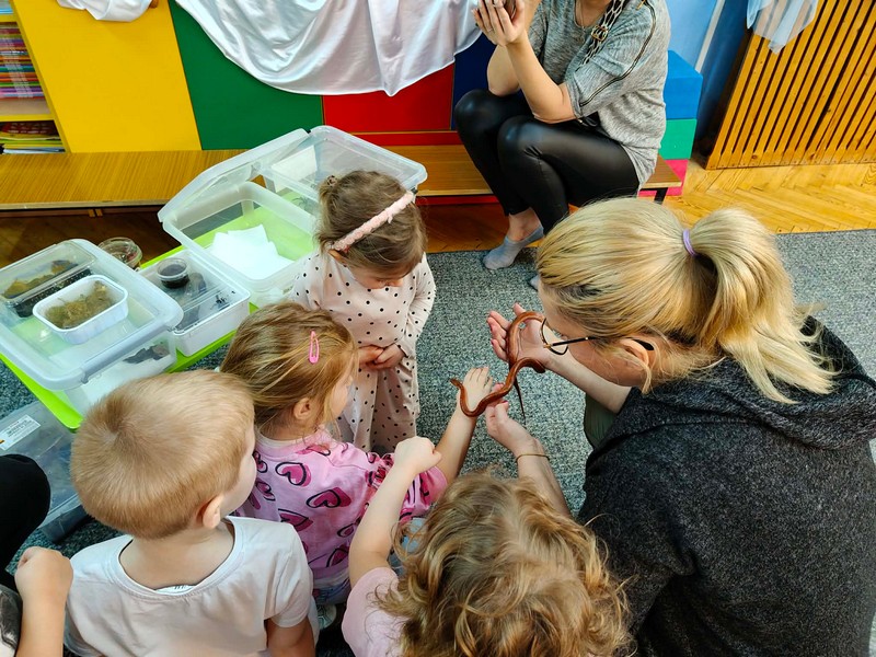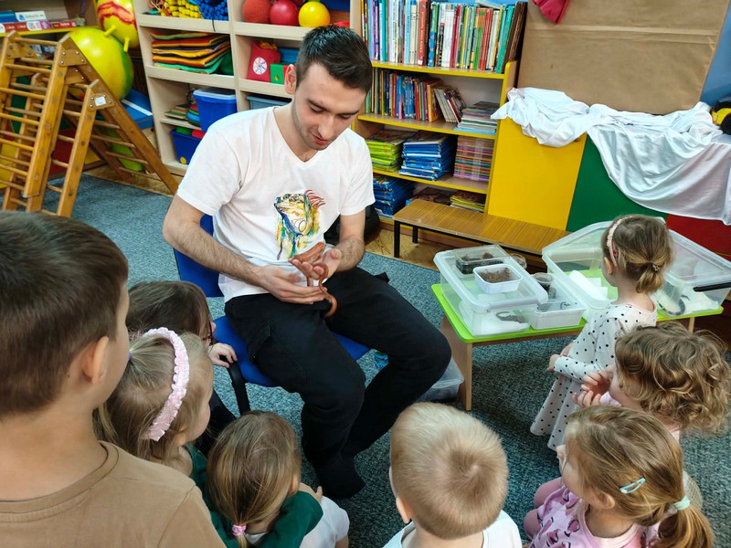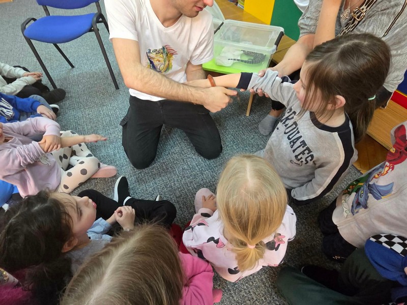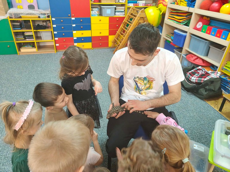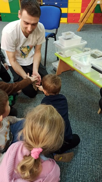 „Spotkanie z gadami” – w przedszkolu odbyła się niezwykła lekcja przyrody, dzieci miały okazję spotkać się z jaszczurką, gekonem, wężem, skorpionem, patyczakiem oraz pająkiem. Zwalczały animozję dotykając, oglądając zwierzęta. Poszerzały informacje nt. ich budowy, zwyczajów oraz sposobu odżywiania.