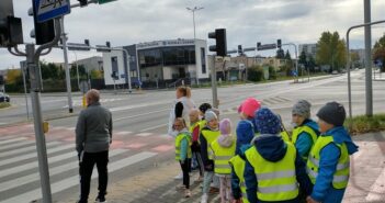 „Poznajemy ruch drogowy”- wycieczka na skrzyżowanie – dzieci z grupy V, obserwowały ruch drogowy.
