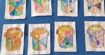 „Nasze zupy marcowe” – prace wykonywane przez dzieci z grupy III, farbą akwarelową i kredkami…